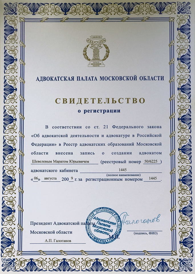С 2009 года Марат Шевелев является адвокатом Адвокатской палаты Московской области. В Адвокатском кабинете под руководством Марата Шевелева работает сплоченная команда профессионалов, которые за 10 лет практики доказали свою исключительную эффективность в решении дел в интересах своих доверителей.